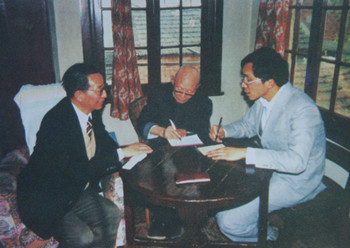 ![]() 邹云翔教授在无闲斋为好友戈宝权(著名翻译家,高尔基《海燕》的翻译者)看病,侍诊的是王钢主任医师 |